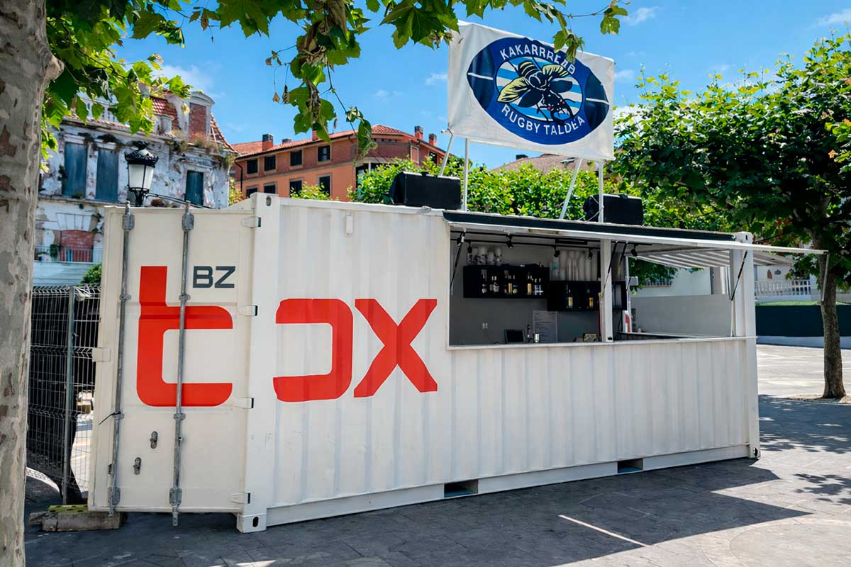 Bar dentro de un contenedor marítimo con terraza en la azotea.